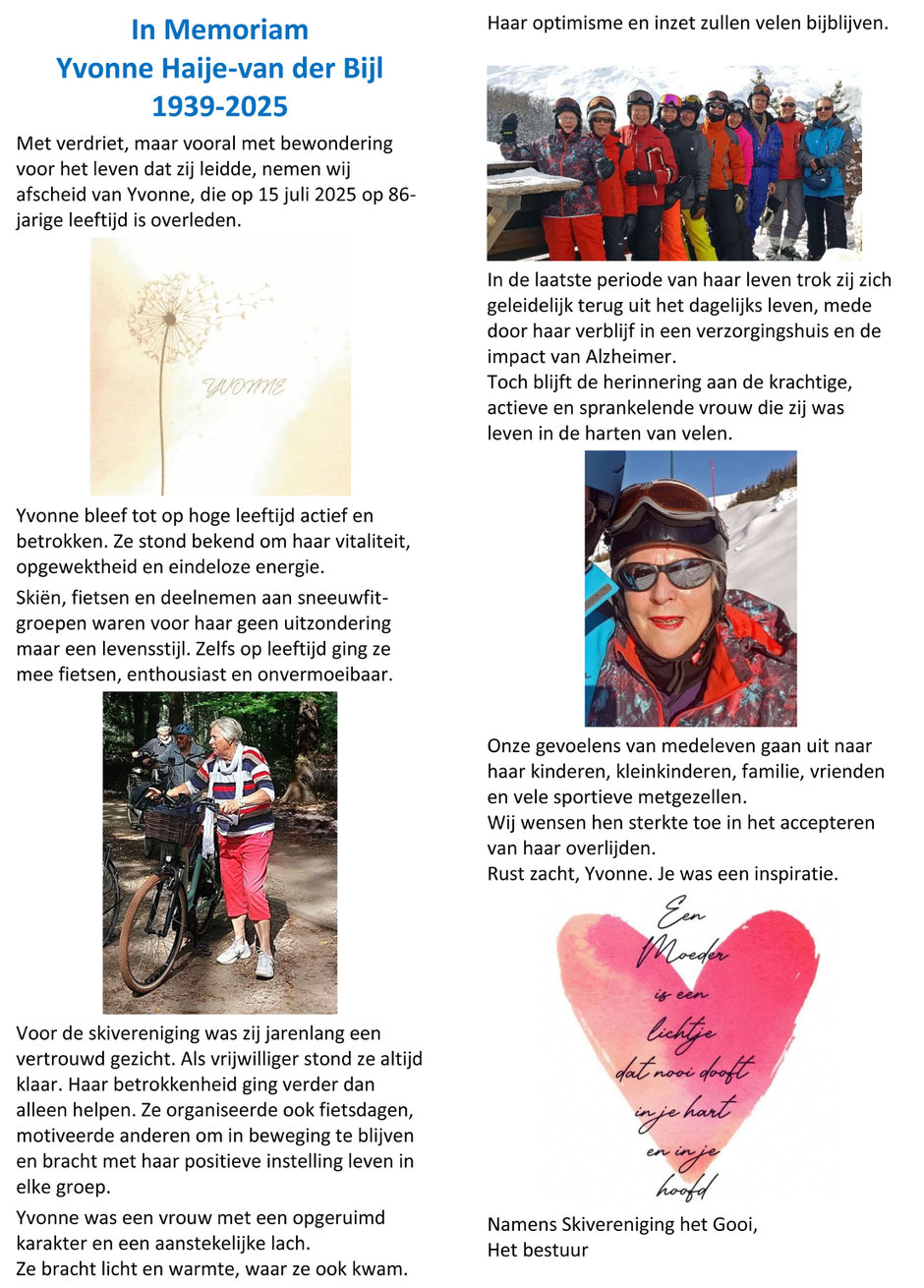 Hanny, sinds 2020 erelid van Skivereniging 't Gooi, heeft zich vele decennia met veel energie als bestuurslid ingezet voor verenigingsreizen naar Lech, redactie van nieuwsbrief de ULLR, Sneeuwfit buitentrainingen en de Skibeurs.